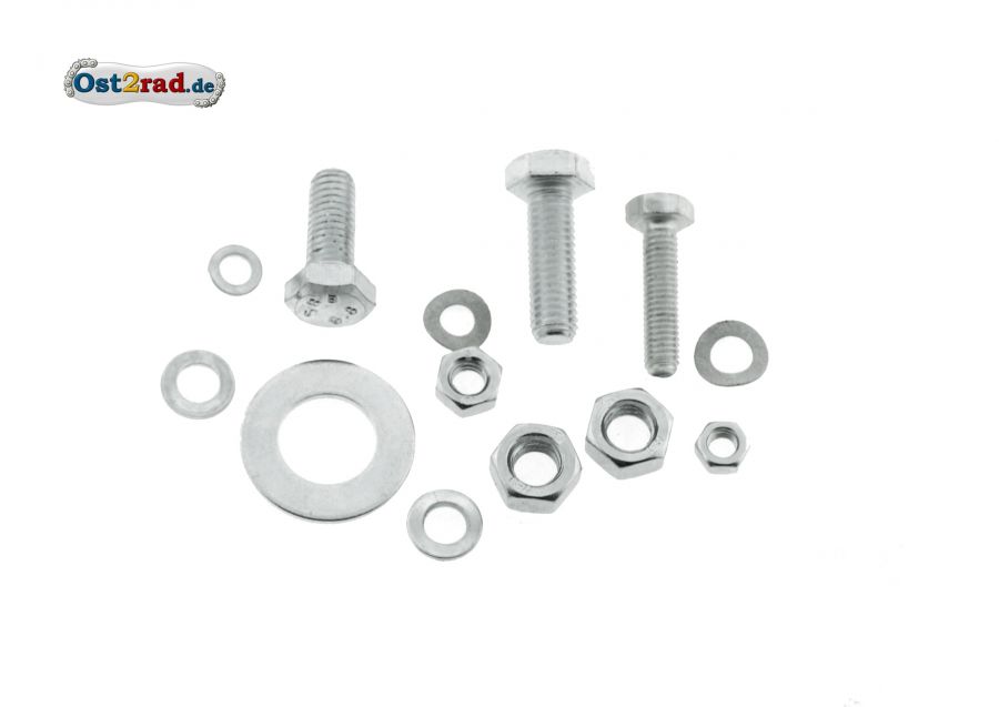 Set de vis dans la catégorie 2.9. Partie cycle- roue arrière et frein arrière spécialement pour ETZ250 composé de 3x vis, 3x rondelles, 1x rondelle élastique, 2x rondelles élastiques et 4x écrous, galvanisés.