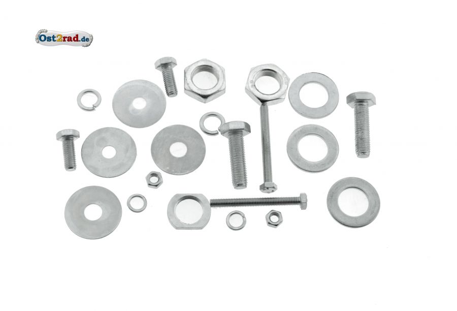 Set de vis dans la catégorie 2.11. Partie cycle - suspension arrière spécialement pour ETZ250 composé de 6x vis, 4x rondelles élastiques, 4x rondelles K, 3x rondelles U, 1x bague de réglage et 4x écrous, galvanisé.