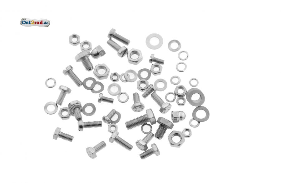 Set de vis dans la catégorie 2.15. Partie cycle - garde-boue arrière, support de feu arrière, support de clignotant et support de plaque d'immatriculation spécialement pour MZ ETZ250 composé de 20x vis, 10x rondelles élastiques, 8x rondelles élastiques, 7x rondelles en U, 13x écrous et 2x écrous borgnes, galvanisés.