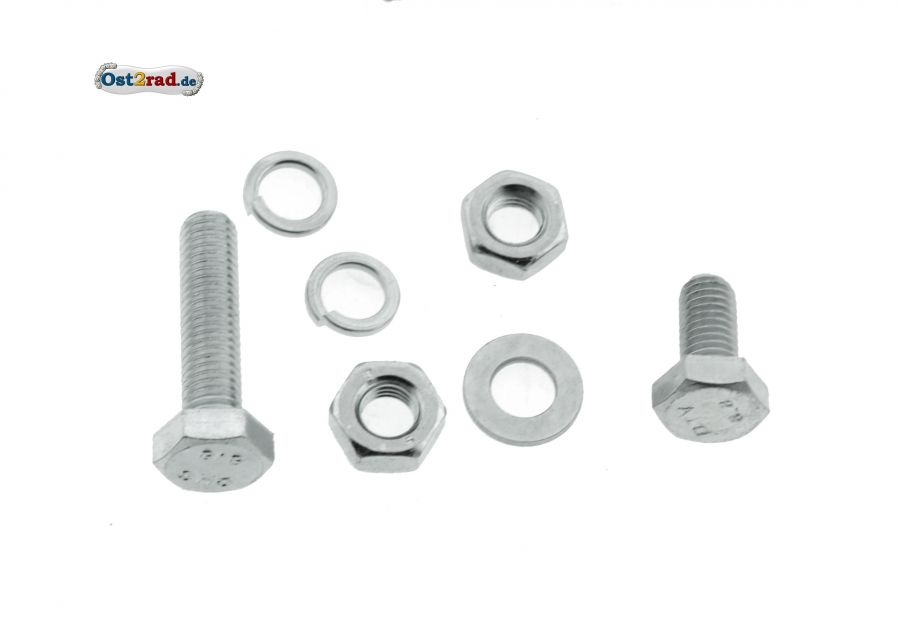 Set de vis dans la catégorie 2.19. Partie cycle - Accessoires Béquille latérale Porte-bagages spécial pour MZ ETZ250 composé de 2x vis, 2x rondelles élastiques, 1x rondelle et 2x écrous, galvanisés.
