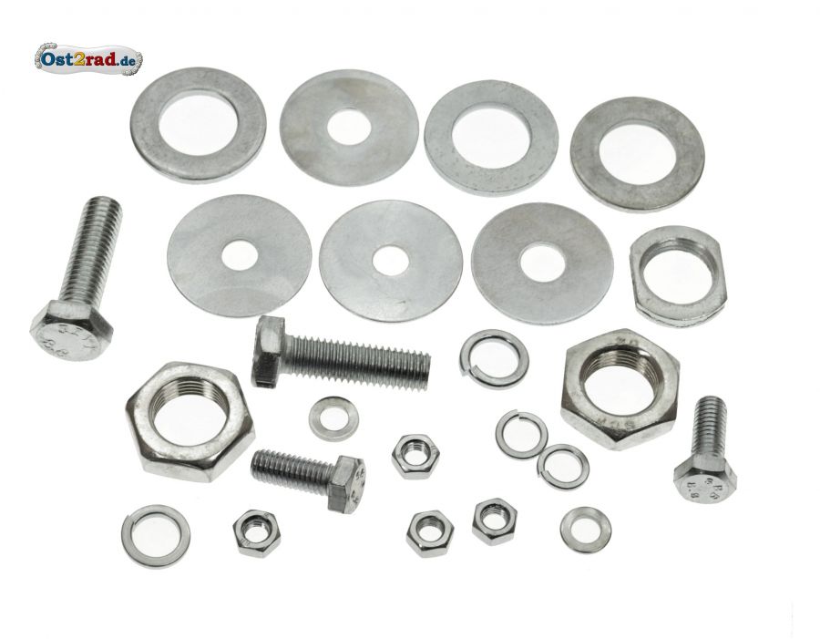 Set de vis pour suspension arrière spécialement pour ETZ251 composé de 4x vis, 4x rondelles élastiques, 2x rondelles, 4x rondelles K, 3x rondelles U, 1x bague de réglage et 6x écrous, galvanisé.